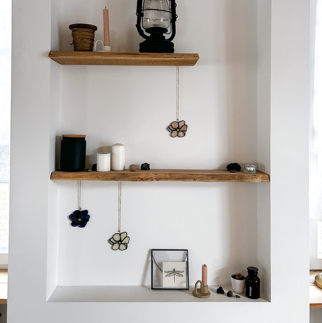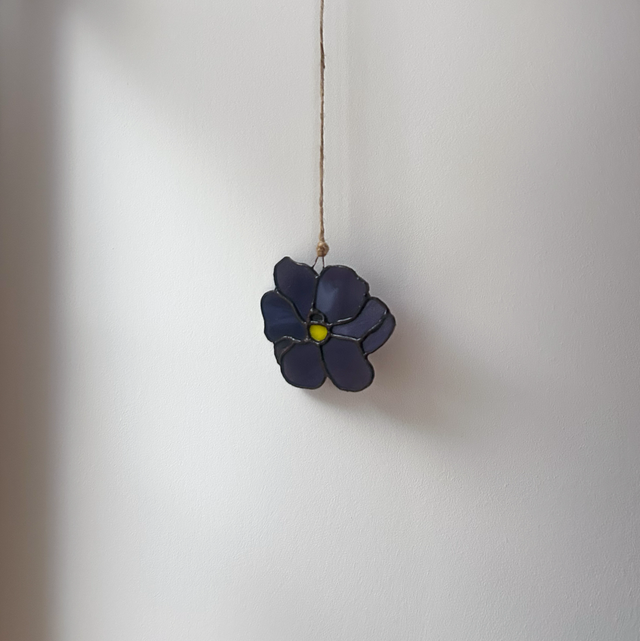 Suspension florale en verre réalisée à la main, entourée d’un ruban de cuivre et soudée à l’étain selon la technique du vitrail Tiffany.