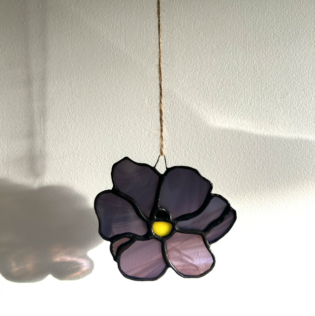 Suspension florale en verre réalisée à la main, entourée d’un ruban de cuivre et soudée à l’étain selon la technique du vitrail Tiffany.
